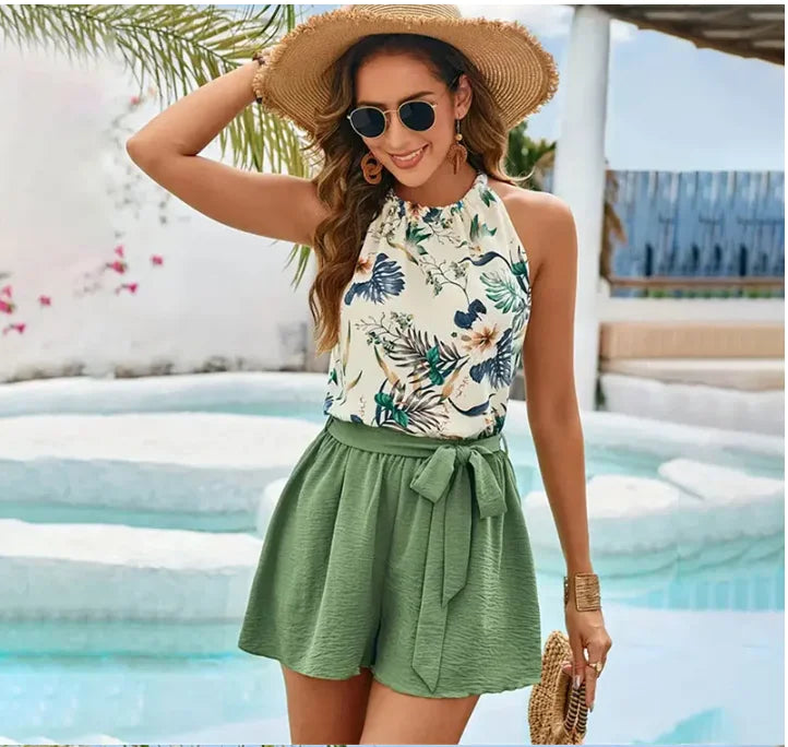 Beach Short Sets For Women 2 Pieces Set Outfit Summer Holiday Flower Print Sling Sleeveless Vest Tie Bow Elegant Suit Mujeres