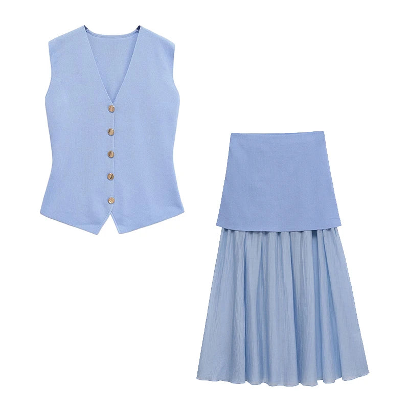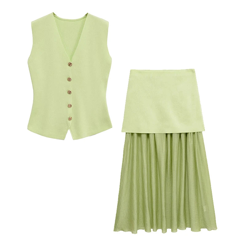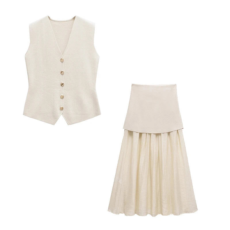 Willshela Women Fashion 2 Piece Set Solid Knitted Single Breasted Tank & Vintage Side Zipper Midi Skirt Female Chic Skirts Set
