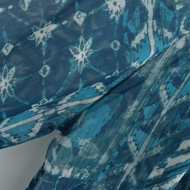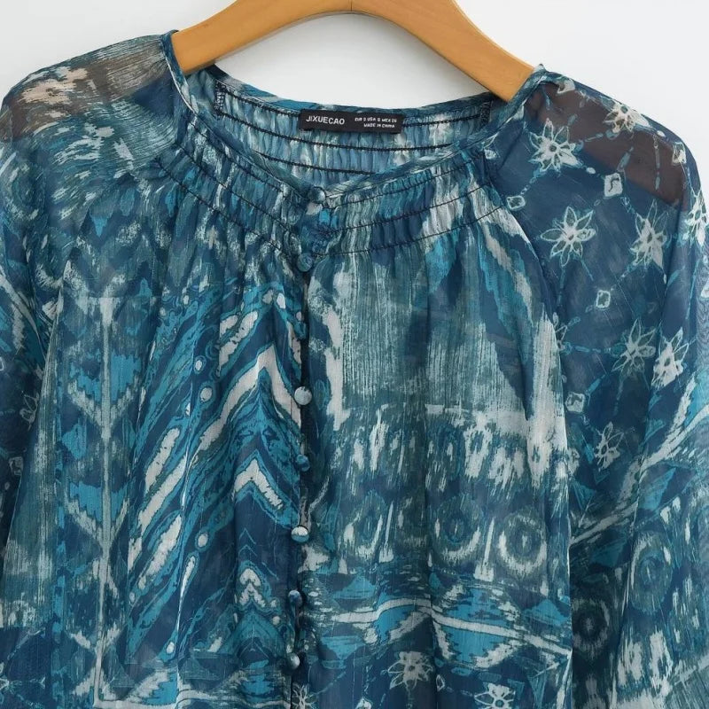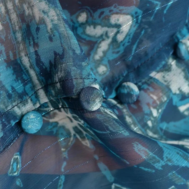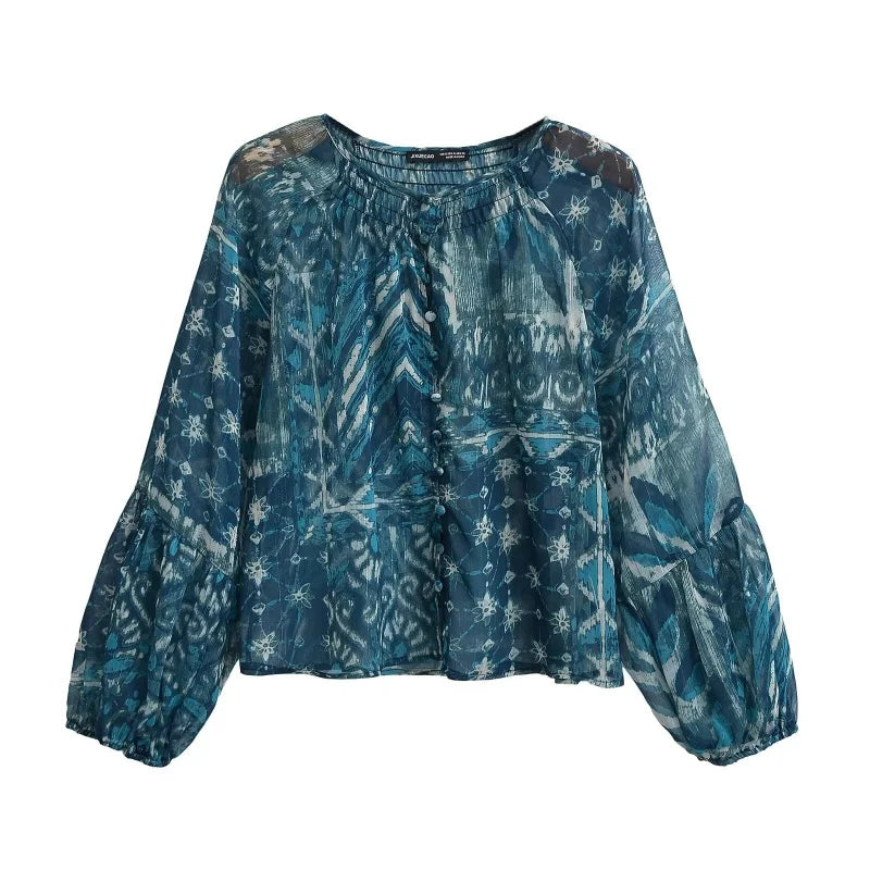 Women’s Spring Long Sleeve Daily Casual Blue Floral Set Single Button Puff Sleeve Top Matching Skirt